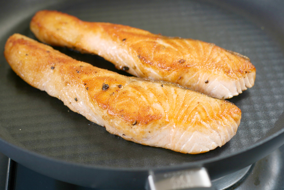 軽く塩コショウをしてフライパンできつね色に焼いたサーモンに、タプナードをかける。